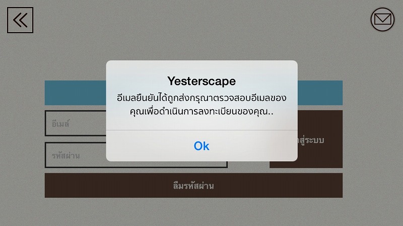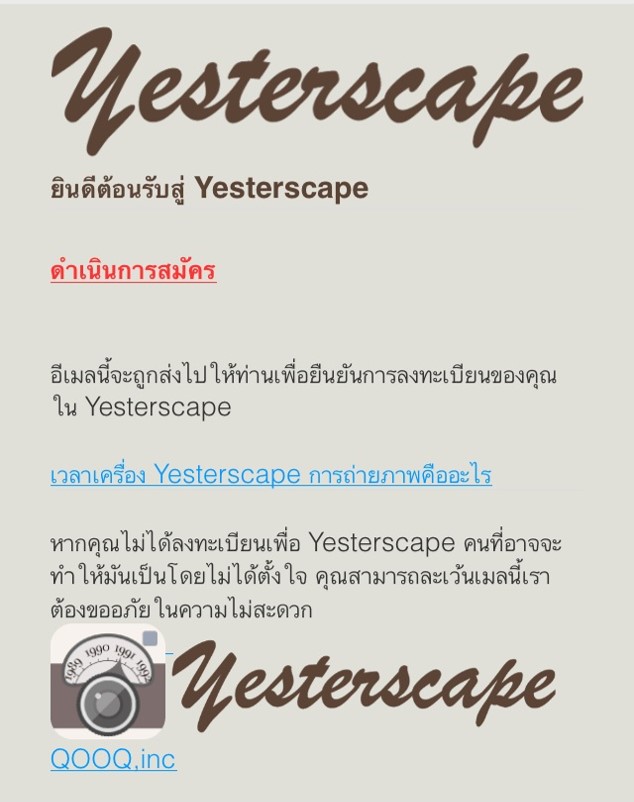 กรุณาตรวจสอบอีเมลที่มีชื่อเรื่อง "YesterScape." หากคุณต้องการลงทะเบียนโปรดคลิกที่ "ดำเนินการสมัคร"(เขียนในสีแดง)